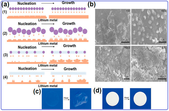 (a) Diagram illustration of lithium deposition with (1) HSE, (2) HSE-I, (3) HSE-II, and (4) GPE. (b) SEM images were obtained by disassembling lithium sheets from symmetric cells applied to cycling tests with different electrolytes, namely HSE, HSE-I, HSE-II, and GPE. (c) GPE and (d) HSE before and after heating at 150 °C for 5 min. Reproduced with permission from Ref. [180]. Copyright 2021, Oxford University.