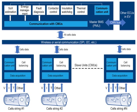 The BMS is usually an integrated unit of software and hardware components. The most common BMS hardware architecture is the modular or master–slave BMS. The topology consists of slave boards named cell monitoring units (CMUs) and a master board named pack monitoring unit (PMU) [16]. The CMUs integrate the sensing ICs, balancing resistors/MOSFETs for passive/active cell balancing, and logic to protect against failures. One CMU can generally handle a unit of up to 16–18 series connected cells. Multiple CMUs can be used when a higher number of cells should be handled. The PMU integrates the main processor where complex BMS algorithms should run. Most commonly, the CMUs are connected with wires to the PMU in a daisy chain of twisted-pair cabling, which carries cell VIT (voltage, current, temperature) measurements back to the PMU with stringent safety requirements and ASIL D (Automotive Safety Integrated Level D) compliance. Alternative communication protocols from CMU and PMUs are based on RS485, I2C, or SPI. In the new generation of the BMSs, the communication between CMUs and the PMU is sometimes fulfilled via wireless communication [16]. It has been argued that BMS wireless communication improves reliability and reduces design complexity by simplifying the wiring harness, removing wires, and isolation connectors [16]. Likewise, it reduces the manufacturing and assembly costs of the battery pack. Despite these benefits, BMS wireless communications have high electromagnetic interference (EMI) susceptibility. As is fully discussed in Section 4, wireless communication will also increase the risk of cyberattacks on BMS communications. In [16], wireless BMSs and the related communication protocols based on Wi-Fi, Bluetooth, and Zigbee are reviewed in detail. The general architecture of the BMS is shown in Figure 3.