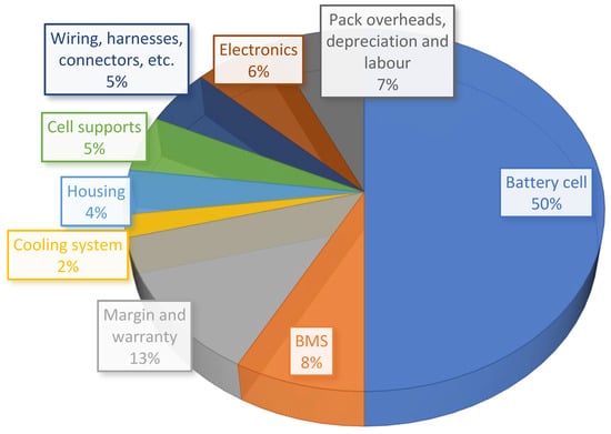 The onboard BMS is usually equipped with microprocessors that have limited memory and computational power. This will place a limit on the achievable performance, since best-in-class algorithms may not be practicable. The limited BMS will compromise the battery pack and EV performance in terms of its safety, lifetime, driving range, etc. Adopting more powerful processors will result in increased BMS cost, which also increases the overall pack cost per EV and weakens the manufacturing economy at a large scale. Figure 4 shows the breakdown of the battery pack cost in a typical mid-size EV application [17]. As seen, the BMS currently constitutes about 8% of the overall pack cost and manufacturers tend not to pass beyond this range to maintain the overall EV affordability [4].