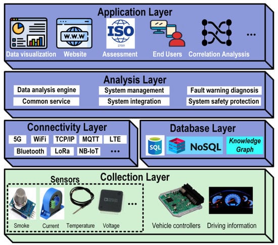 Concerning the architecture, the CBMS consists of three main layers, namely, the hardware and connectivity layer, the analysis layer, and the service layer [4]. The hardware and connectivity is the lowest-level layer in the CBMS architecture and is responsible for edge-processing and collection of various sensory transaction data coming from the battery pack and the IoT platform. The transaction data may include, but are not limited to, battery current, cell voltages, cell temperatures, smoke sensor data, pressure, strain, etc. State data such as SoX information or processed data may also be transmitted to the CBMS to enable specific use cases. In practice, the types of data and transmission rate have to be optimized to reduce the burden on the communication and cloud. For example, instead of transmission of all raw battery data, more targeted data at regular intervals can be communicated to reduce the required bandwidth. The analysis layer is the middle layer and is responsible for storing, processing, and analyzing the battery data. Different battery data, such as transaction data, processed data, state data, and link data (metadata needed to link different models/algorithms/platforms in the service layer of the CBMS), should be stored here [4]. In addition, all the CBMS algorithms will be implemented in this layer. The uppermost layer is the service layer, which sometimes is also referred to as the application layer. It provides insight and visualizations of battery analytics results and also serves as an interface to connect to other platforms that require CBMS data. User interfaces (UIs) and application programming interfaces (APIs) will be implemented in this layer. There have been some extensions to the aforementioned core architecture. For instance, in some works, a separate database or storage layer is considered for storing different battery data, while some architectures also include a layer to address security/cybersecurity. A typical architecture of the CBMS is shown in Figure 6 [18].