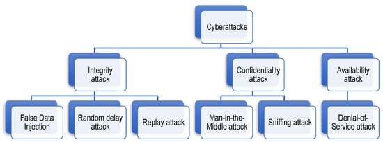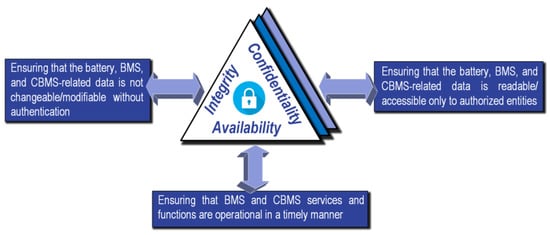 As explained in the figure, the CIA requirements ensure that the battery and CBMS data cannot be accessed, changed/modified, disrupted, or interrupted without proper authentication. The concurrent assurance of the CIA requirements can result in an acceptably secure CBMS. Different types and scenarios of attacks can be potentially launched to violate the CIA’s conditions. The attack categorization and definitions can be slightly different for different application contexts. Figure 8 depicts the CBMS cyberattacks classification depending on the CIA requirements attacked [44,50,51]. It should be noted that in some attack conditions, more than one CIA requirement might become compromised.