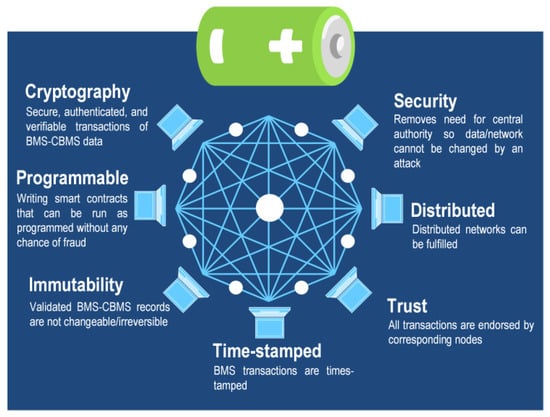 • Blockchain technology: Blockchain is a secure distributed database for maintaining constantly growing data records. It was initially developed to secure cryptocurrency transactions, but lately, it has been explored for new cloud applications including CBMSs. Concerning the CBMSs, it has been discussed that the blockchain can be used to enhance both software and hardware aspects [68]. For instance, the blockchain can be used to manage critical activities related to the transaction and sharing of battery data between the CBMS and the BMS terminal nodes [52]. The blockchain transactions are time-stamped, cryptic, and immutable, meaning that the data cannot be read or modified from single communication nodes. Furthermore, transactions will be endorsed by corresponding nodes so the authenticity of the communication nodes and data can be validated. Likewise, the distributed/decentralized nature of the blockchain significantly lowers the cybersecurity risk in case of successful attacks on one or more communication nodes. Key features of blockchain technology are described in Figure 12 [73].