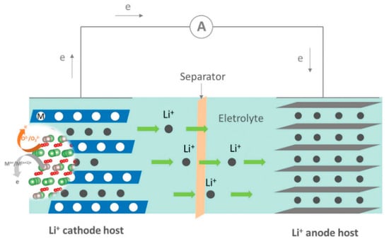 The LIB consists of four parts: the anode (negative electrode), the cathode (positive electrode), the electrolyte, and the separator [12,17]. During the charging and discharging process of the battery, as shown in Figure 1, LIBs are de-embedded back and forth between the positive and negative electrodes through the electrolyte and the separator, hence the name “rocking-chair battery” [18]. During charging, lithium ions receive energy from the outside, move to the anode, and embed into the anode, forming a Li-rich ion state at the anode; during discharge, lithium ions carry energy from the negative electrode to the positive electrode, while electrons move back and forth through the external circuit to generate current during charge and discharge [19].