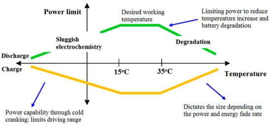 The optimal operating temperature range of LIBs is relatively narrow, and too low or too high temperature will affect the performance of the battery. As shown in Figure 2, the LIB shows the best performance only when it works within 15–35 °C. At lower temperatures, the ability of lithium ions to diffuse is limited, and it increases the internal impedance, and the discharge capacity of the battery decreases [7]. In contrast, the active chemistry in the battery can be damaged at high temperatures, which can result in irreparable damage to the capacity and life of the battery and possibly cause thermal runaway [35]. Thermal runaway is one of the main safety issues facing LIBs. It refers to the uncontrollable rise in battery temperature caused by a chain reaction of heat release from a single battery cell. When the battery temperature continues to rise and the heat cannot be dissipated in time, if no measures are taken to control it, thermal runaway will occur when the temperature threshold is exceeded [36]. In the process of thermal runaway, a large amount of heat and harmful gases are often generated, and even lead to battery fire and explosion [2].
