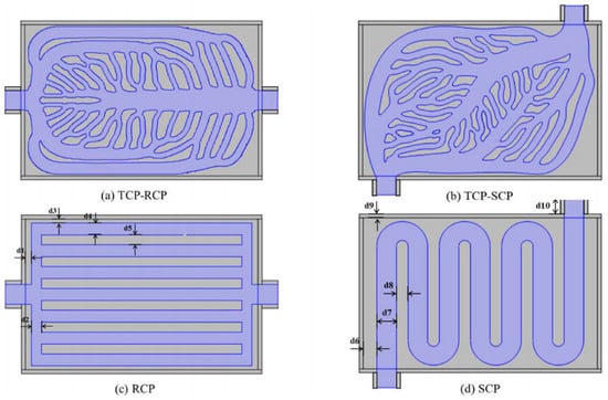 In the study of channel width, Jarrett and Kim [59] studied the influence of channel structure on its performance based on the serpentine channel cold plate and proposed several channel designs (Figure 8). Through a numerical optimization algorithm, it is concluded that the minimum average temperature and pressure drop can be optimized by increasing the channel width to the maximum extent. To optimize the design of uniform temperature, the flow channel with a narrow inlet and wide outlet should be adopted. In addition, Qian et al. [86] used numerical analysis to study the performance of parallel channel cold plates and found that when the channel width increased from 3 mm to 6 mm, the pressure drop of the system decreased by 55%. On the other hand, the distance between channels is also important to improve the performance of the cold plate. Choi et al. [87] used the CFD method to assess the design of the serpentine channel cold plate and found that narrowing the channel spacing near the outlet of the cold plate is beneficial to improve the cooling performance. Based on the above research, appropriately increasing the width of the channel and reducing the spacing between the channels may be an optimal choice to improve the performance of the cold plate.