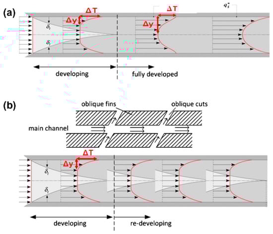 Boundary layer development: (a) traditional straight channel; (b) inclined fin microchannel [91].