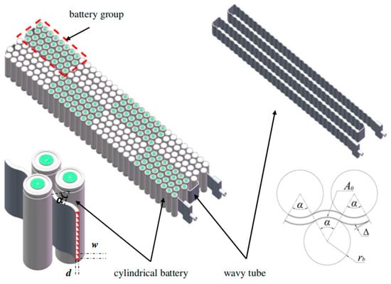 The location of the cold plate, the contact area between the cooling structure and the battery, the number of cooling channels, and the coolant flow rate have an important influence on the cooling performance of the system. According to the position of the cold plate, it can be divided into bottom cooling and side cooling. Darcovich et al. [92] examined the cooling effectiveness of the two cold plate locations by putting the cold plate on the side and bottom of the prismatic battery. Because side cooling has more contact areas with the battery than bottom cooling, it has a lower maximal temperature and greater temperature uniformity. Tang et al. [93] designed a multichannel wavy tube for cylindrical battery packs. As shown in Figure 10, the two sides of the wave tube have radians that can be in close contact with the side of the battery. The maximum temperature and maximum temperature difference of the battery pack were studied by changing the wavy contact angle () and mass flow. The wave tube can reduce the uneven temperature in the battery pack and has a good heat dissipation capability at low flow rates, according to simulation and experimental results. Similarly, Zhao et al. [94] also designed a side cooling wave channel for the battery pack. Through simulation, it was discovered that even at a charge–discharge rate of 5C, the wave channel was still practical for the thermal control of the battery.