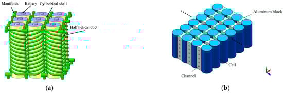 A key problem in indirect liquid cooling is that there is an air gap between the battery surface and the cooling structure, resulting in a decrease in cooling efficiency. Therefore, it is crucial to design a suitable contact area to increase the effectiveness of heat transfer. Zhou et al. [96] investigated a liquid cooling system based on the half-helical duct, as shown in Figure 11a. They pointed out that this structure is more efficient due to the small volume of liquid and no stagnation zone. Rao et al. [97] proposed a variable contact surface cylindrical BTMS, as shown in Figure 11b. According to the simulation results, the BTMS with a changeable contact surface helps to increase the battery’s temperature uniformity. Siruvuri et al. [98] designed an s-shaped cooling channel and analyzed the influence of the contact area between the channel and the battery on BTMS. They pointed out that increasing the contact area can improve the cooling effect of the battery. In addition, the contact area with the battery can be controlled by changing the width of the cold plate [74] and the angle between the wave tube and the battery [93,94], thereby improving the cooling performance of the BTMS.