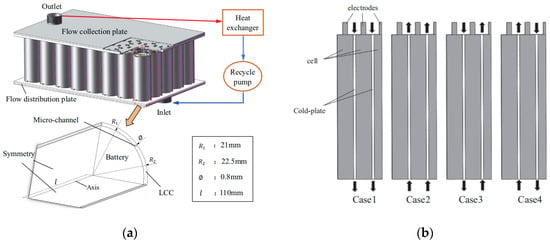 The number of cooling channels and the direction of flow are also two key factors in improving cooling performance. Zhao et al. [99] designed a new liquid cooling system for cylindrical LIBs. A liquid-cooled cylinder (LCC) with microchannels was positioned around the battery, as seen in Figure 12a. Numerical simulations have found that the maximum cell temperature can be controlled to within 40 °C when there are no less than 4 channels and a mass flow rate of 1 × 10−3 kg/s. For the flow direction, the reverse flow of some channels has little effect on the maximum temperature and temperature difference of the battery. Qian et al. [86] established a three-dimensional liquid cooling model based on the microchannel cold plate. The results showed that the best cooling effect was obtained when the number of channels was five. They designed four cases for different flow directions (Figure 12b). It is found that the maximum temperature of cases 1 and 3 is almost the same, which is 8% lower than that of cases 2 and 4. Deng [77] similarly found that cooling efficiency continued to improve as the number of channels increased, but after the number of channels exceeded five, the improvement became insignificant after increasing the number of channels further. Deng et al. [95] investigated the effect of liquid flow direction in the cold plate channel on cell temperature and found that changing the flow direction of the liquid facilitated the uniformity of the cell temperature.