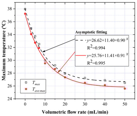 The maxima of the battery surface temperature () and the average battery surface temperature ( ) at different TO volumetric flow rates [101].