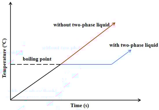 The BTMS based on boiling heat transfer has attracted attention because of its ability to effectively control the temperature of the battery pack and maintain a uniform battery temperature. Commonly used in the boiling cooling of batteries is the Novec 7000 from 3M in St. Paul, MN, USA, which is non-flammable and has a boiling point of 34 °C, just within the optimum operating temperature range for LIBs [51]. When the temperature is below the boiling point, boiling liquid cooling is a single-phase cooling method that has a much greater cooling capacity than air and can improve the heat distribution of the cell even if boiling does not occur. Once the temperature exceeds the boiling point, the liquid will absorb a large amount of latent heat during evaporation into the gaseous state, keeping the temperature around the boiling point (Figure 16). However, once the liquid has evaporated into a gaseous state, an additional condensation system is required to collect the boiling liquid for recycling, which adds to the complexity of the BTMS. Wu et al. [114] proposed a boiling cooling BTMS, in which Novec 7000 is used as a coolant in direct contact with a 20 Ah LiFePO4 LIB. The surface temperature of the battery can still be kept within 36 °C when the coolant is not flowing, and the temperature uniformity of the battery is also significantly enhanced. The authors proposed an intermittent flow mode, in which the maximum temperature and maximum temperature difference of the cell are controlled to below 36 °C and 2 °C, respectively. Wang et al. [115] and Gils et al. [116] studied Novec 7000 as a coolant in direct contact with the battery, and also obtained a satisfactory cooling effect.