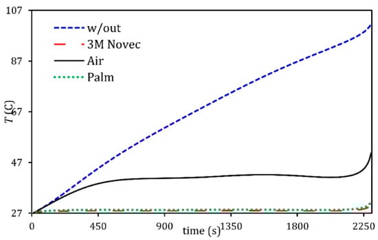 In the area of BTMSs, M&I has introduced an ester-based immersion cooling medium fluid called MIVOLT with a high ignition point and easy biodegradability, including two products (DF7 for low viscosity and DFK for high viscosity) specifically for use in cooling electric vehicle batteries [53]. Qubeissi et al. [121] proposed a biodiesel-based immersion cooling system using four biodiesels (palm, karanja, jatropha, and mahua oils) in comparison to two conventional coolants (air and 3M Novec). The simulation results showed that using biodiesel for the BTMS was feasible because it could keep the battery pack temperature within a reasonable range. As seen in Figure 17, the cooling effect of palm oil and Novec is essentially the same. Moreover, because palm oil has a lower density than Novec, it facilitates a reduction in total weight. In conclusion, esters have been employed in transformers, but research on BTMSs is still lacking. Esters would be a good candidate coolant for BTMS if a low-viscosity and less oxidizable ester could be discovered as a cooling medium for immersion cooling.