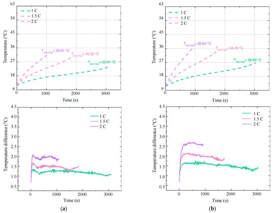 Maximum cell surface temperature and temperature difference curves at different discharge multipliers: (a) the battery immersed in the mineral oil; (b) the battery immersed in the silicone oil [128].