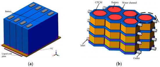 The currently popular BTMSs can be divided into air cooling, liquid cooling, phase change material (PCM), heat pipe, and composite cooling. With its simple structure and low cost, air cooling has been widely used in early BTMSs. However, it is challenging to meet the demand for battery heat dissipation under the circumstance of rapid charging due to the low specific heat capacity and heat transfer coefficient of air, and limited cooling capacity [12,13]. PCM has become a research hotspot in battery thermal management due to its large latent heat of phase change and no need to consume additional energy, but its low thermal conductivity and easy leakage problems hinder its application in electric vehicle BTMSs [14]. Studies have shown that the thermal conductivity of PCM can be improved by adding foam metal, expanded graphite, carbon fiber, and other materials to PCM [8]. The heat pipe has the advantages of high thermal conductivity, excellent stability, and low maintenance cost, and has broad application prospects, but it is not currently widely used in battery thermal management due to its small contact area and large system volume [12]. Composite cooling is a combination of two or more cooling methods based on a single cooling method, used to meet higher heat dissipation requirements, as well as to improve the temperature distribution of the battery module, showing outstanding cooling effects and attracting the attention of researchers.