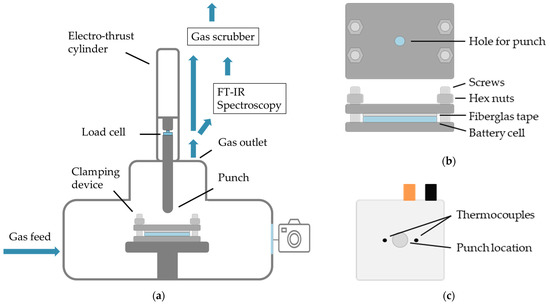 Visualization of the test setup: (a) test chamber with illustration of the cell clamping device and the electric cylinder, including the penetration tool and the gas flow; (b) cell press with the battery cell and insulation material; (c) cell with positioning of the thermocouples.