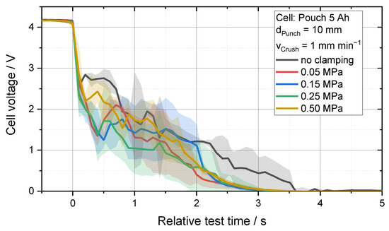 When cracks occur in a separator and electrodes, the electrodes touch, forming a conductive connection (i.e., an internal short circuit). This connection allows an electrical current to flow, causing the battery to discharge. The resulting drop in cell voltage over time is shown in Figure 2 as a function of the relative test time. The time has been zeroed to the time at which the short circuit occurred. The cell voltage starts at approximately 4.2 V, which corresponds to a SOC of 100%. A sharp voltage drop occurs at 0 s relative test time. This initial voltage drop results in a voltage below 1.5 V for the cells with clamping stress from 0.05 MPa to 0.25 MPa. For the highest compressed cell, the voltage drops only to 2.2 V, whereas the voltage drops to 2.57 V for the unclamped cell. Over a period of about 2 s, the cell voltage decreases at a much slower rate and with increased standard deviation. As soon as a voltage drop occurs, Joule heat is generated due to the high local current flow [28]. When the critical temperature for the used material is exceeded, a chemical chain reaction with various exothermic reactions is initiated. The reaction products of these reactions are, in addition to solids, mostly gaseous and cause an associated particle detachment of the coating from the current collector foils. Both gas formation and particle detachment increase the short-circuit resistance between the electrodes themselves and between the punch and the electrodes. Due to the resulting lower current flow in the short-circuit region, the cell voltage relaxes for a short period with a high standard deviation.