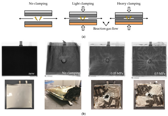 Effects of gas development in a battery cell during thermal runaway: (a) Visualization of gas flow from the cell in the unclamped state compared to light and heavy clamping; (b) X-ray images and photos of battery cells before and after thermal runaway at different clamping stresses.