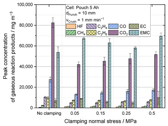 Figure 7 shows the peak concentrations of all measured infrared-active gases in the form of a bar chart. CO2, CH4, C2H4, and C2H6, like CO, are reaction products of the electrolyte decomposition reaction and the electrolyte reaction with the cell components [29,30]. Therefore, higher concentrations of these reaction products were measured for the unclamped cells. The increase in concentration for CO2 is very similar to that of CO at about 77% of the mean value of the clamped cells, whereas a much lower increase of about 42% is measured for CH4. For different clamping compressions, the same asymptotic regression curve is obtained for CO2 and CH4 as for CO, as shown in Table 1. For C2H4, this course deviates slightly, whereas the trend in C2H6 follows an up and down movement. As CO2 and CO are preferentially formed in the decomposition reactions, favorable conditions may cause the evolution rate of C2H4 and C2H6 to deviate as an intermediate product of the decomposition reaction. In addition to the decomposition of the electrolyte, it is also converted to a gaseous state and detected in the gas analysis. As higher concentrations of electrolyte decomposition products were measured for the unclamped cells, the concentration of gaseous electrolyte components should, in principle, decrease, as the same amount of reactants were present in all cells. Although the concentration of EMC for unclamped cells is slightly lower, it is significantly higher than expected at 53,814 mg m−3 ± 5271 mg m−3 compared to 64,460 mg m−3 ± 2324 mg m−3, the mean value of all clamped cells. This observation could be due to an incomplete evaporation of the electrolyte during the thermal runaway, as is evidenced by the moist particulate residue on the wall of the test chamber for the clamped cells. As soon as the ejected wet electrode material touches the wall of the test chamber, it cools down to laboratory ambient temperature. As the boiling point of EMC is 107 °C and that of EC is 248 °C [31], no further phase change or reactions can take place. As a result, the absolute amount of gas is lower for the clamped cells.