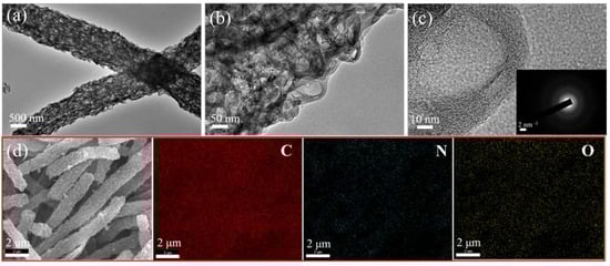 The inner pore structure of ZPCNF-1.5 was analyzed by TEM and HRTEM, displayed in Figure 3. In Figure 3a,b, the fiber of ZPCNF-1.5 was seen to have a diameter of about 1 μm, and consist of various 70-to-100 nm-diameter hollow particles connected by carbon matrix, indicating the post-carbonization transformation of ZIF-8 particles to a hollow structure. In Figure 3b, the carbon nanofibers of ZPCNF-1.5 were observed to be almost transparent-like, suggesting the existence of a rich porous structure. The HRTEM image of ZPCNF-1.5 is shown in Figure 3c, where no characteristic lattice fringes could be observed. By further analysis of the selected area electron diffraction (SAED) image in the inset of Figure 3c, the vague rings of the SAED pattern and the disordered lattice spacing revealed the amorphous carbon structure in the porous carbon fiber [32,33]. It also partly reflects the material’s high SSA and good electrochemical stability [34]. The elemental composition of ZPCNF-1.5 carbon nanofibers was investigated by SEM and elemental mapping, and in Figure 3d, C, N and O were shown to be uniformly distributed without evident aggregation, indicating the successful incorporation of N and O atoms into carbon fibers. The residual cavities, porous structures and N and O atoms doping of ZPCNF-1.5 can promote electrolyte permeation, ions diffusion and accommodation of volume changes during the discharge-charge process.