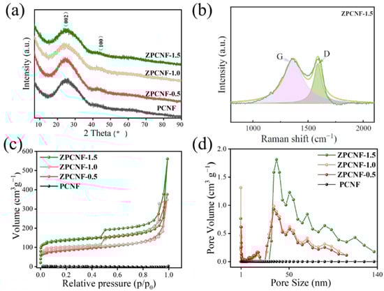 XRD patterns (a), Raman spectra (b), N2 adsorption/desorption isotherms (c), and pore size distribution (d) of PCNF, ZPCNF-0.5, ZPCNF-1.0 and ZPCNF-1.5.