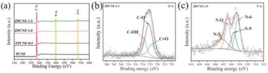 The surface element composition and atomic valence state of PCNF, ZPCNF-0.5, ZPCNF-1.0 and ZPCNF-1.5 were analyzed by X-ray photoelectron spectroscopy (XPS). As shown in Figure 5a, PCNF, ZPCNF-0.5, ZPCNF-1.0 and ZPCNF-1.5 exhibited prominent O 1s and N 1s peaks, indicating that their surfaces are abundant in N and O elements, which can enhance their capacitive properties. Additionally, the elements of N and O can provide pseudo-capacitance while enhancing the substance’s hydrophilicity. The results of the fits to the high-frequency O1s peaks of all samples are shown in Figure 5b and Figure S2a–c, where the O1s peaks can be fitted to three different forms of O. The 530.6 eV peak represents the O atom in the C=O structure, while the other peaks are at 533.2 eV and 534.4 eV, with the 534.4 eV peak for the presence of O in the C-OH structure, while the 533.2 eV peak for the O atom in the C-O structure [47]. The N1s region spectra (Figure 5c and Figure S3d–f) can be fitted to four forms of N, pyrrolic nitrogen (N-5), pyridinic nitrogen (N-6), graphitic nitrogen (N-Q), and nitrogen oxide (N-X). N-5 and N-6 are the main N-containing functional groups, active sites during electrochemical processes. N-X, N-5, and N-6 can be reversibly switched between different morphologies, providing certain pseudo-capacitance for carbon materials. Moreover, N-Q was reported to improve the carbon fiber electrical conductivity by supplying more free electrons in the carbon structure [48].