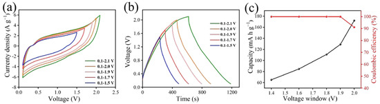CV curves with different voltage windows for ZPCNF-1.5 (10 mV s−1) (a). GCD curves with varying voltage windows (1 A g−1) (b). Specific capacities and Coulombic efficiency derived from GCD curves (c).