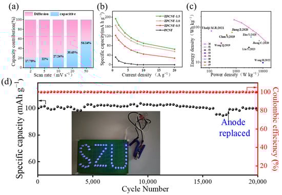 The Dunn method was employed to analyze the contribution of pseudocapacitive behavior. The diffusion-controlled and capacitive charge storage processes are described by Equation (S4) [49,50]. In Figure 8a, the capacitive contribution percentage was seen to increase to 17.78%, 22%, 27.24%, 35.65%, and 56.14% at 2, 5, 10, 20, and 50 mV s−1, respectively, demonstrating the rapid charge storage kinetics in the cathode, with a low redox process controlled by diffusion. With the increase in scan rate, the dynamic process of ZPCNF-1.5 gradually changed from diffusion-controlled behavior to capacitance-controlled behavior. Based on GCD measurement results, the corresponding specific capacitances at different current densities were obtained for PCNF, ZPCNF-0.5, ZPCNF-1.0 and ZPCNF-1.5 electrodes (Figure 8b). With the rise of current density, the specific capacitance of capacitors showed a downtrend, with the highest specific capacitance for ZPCNF-1.5 at any current density. At 1 A g−1 current density, the specific capacitances were 32, 123, 165 and 193 mA h g−1 for PCNF, ZPCNF-0.5, ZPCNF-1.0 and ZPCNF-1.5, respectively. The specific capacity of ZPCNF-1.5 could reach 193 mA h g−1 at 1 A g−1 current density while remaining at 65 mA h g−1 at 20 A g−1 current density. This indicated a ZIF-8 amount-dependent increase in the capacity of the material, which is related to the most significant SSA of ZPCNF-1.5 and the ability of N and O doping. Figure 8c shows the Ragone diagram of ZPCNF-1.5 derived from the GCD test results [26,51,52,53,54,55,56,57]. At 841.2 W kg−1 power density, the energy density was 162.6 Wh kg−1. At 12.2 kW kg−1 output power density, 40 Wh kg−1 energy density could still be maintained, reflecting the outstanding rate performance and relatively high energy density of ZPCNF-1.5. The cycle stability of Zn//ZPCNF-1.5 ZHSCs was further investigated at 10 A g−1 current density. As shown in Figure 8d, ZPCNF-1.5 also exhibited high cycling stability after 20,000 cycles, retaining 98% capacity and achieving nearly 100% Coulombic efficiency. After about 16,000 cycles, capacity retention dropped to 95.5% and returned to its original value after replacing the zinc anode. This indicated that the material has good cycling stability, and the drop in capacity retention is induced by the development of zinc dendrites during zinc anode degradation. Meanwhile, as shown in the inset of Figure 8d, the device of Zn//ZPCNF-1.5 ZHSCs could drive a “SZU” logo formed of 49 blue light-emitting diode (LED) lamps in parallel, demonstrating its practical application potential. Then Figure S6 displays the self-discharge curves of Zn//ZPCNF-1.5 ZHSCs, from which a sharp decline followed by flattening out can be seen. The voltage of Zn//ZPCNF-1.5 ZHSCs started to drop sharply from 2 to 1.5 V within 4 h, which was followed by a slow self-discharge process that resulted in a retained potential of 1.48 V even after 24 h, which means that Zn//ZPCNF-1.5 ZHSCs possesses preferable anti-self-discharge property to some extent.