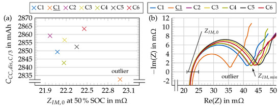 In addition, Figure 2 shows the initial characteristics of the six selected cells based on single-cell measurements at 25 ± ambient temperature, as obtained using a constant current (CC) C/3 discharge capacity measurement (based on the nominal capacity indicated in Table 1) and potentiostatic EIS measurements at 50% state of charge (SOC) [27,34]. The battery cells used exhibited original production variations and were neither artificially aged nor modified to simulate inhomogeneity.