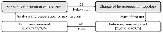 The present individual discharge capacity of all cells was determined before starting the multi-cell test runs (charged to 100% SOC using CC and constant voltage (CV) phases; subsequent CC C/20 discharge until discharge cutoff of ). By utilizing the individually measured discharge capacities, all cells were set to 50% SOC based on their individual charge throughput prior to the first multi-cell investigation. Two EIS measurements were performed for each interconnection topology being investigated, whereby a reference measurement was followed by a fault measurement. The reference measurement always refers to the investigation of the respective interconnection topology with six intact cells (C1–C6), while the fault measurement refers to the evaluation with five intact cells and one defective cell in the same interconnection (C1, C2–C6). Based on extensive preliminary investigations, the use of a galvanostatic EIS in the measurement range from 5 to 10 was selected for all of the multi-cell topologies investigated (10 points per decade (logarithmic spacing), 200 excitation amplitude per string, 0.1 wait period before each frequency measurement, 4 measures per frequency, activated drift correction). Figure 3 shows the schematic test sequence including the relaxation times between the process steps.