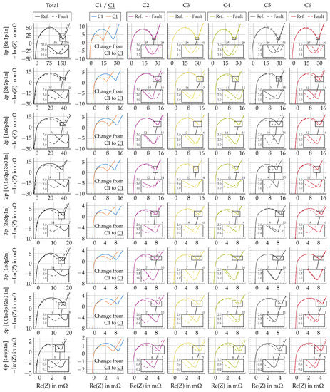 Figure 4 presents a comparison between the reference and fault EIS measurements of all multi-cell topologies investigated, i.e., for both the total setup voltage deviations as well as the deviation of the single-cell impedance curves at positions 1 to 6 of the respective topology. Furthermore, all calculated values of of each cell at the topologies investigated are given in Table A1.