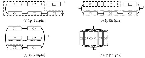 The present research combinatorially tested series and parallel topologies of six individual cells, thus resulting in four supergroups based on the number of parallel strings: 1p, 2p, 3p, and 6p. The topologies with two parallel strings (2p) and three parallel strings (3p) can each be interconnected in three different configurations: parallel strings, serial modules, or additional cross-connectors. A total of eight different interconnection topologies resulted. A letter and number system is used as nomenclature, where s represents the number of serially connected cells, p the number of parallel connected strings per module, and m the number of series connected modules. Regarding the fault measurements, the first cell at the main positive contact (C1, position 1) was replaced by a cell with deviating characteristics (C1). Figure 1 gives an overview of all interconnection topologies under investigation and their nomenclature.