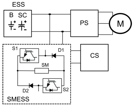 Hybrid energy storage system with SMESS (B—battery, SC—supercapacitor, CS—control system, PS—powertrain system, M—motor, D1 and D2—diodes, S1 and S2—switches).