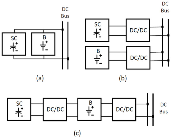 Hybrid energy storage systems (HESS): (a) passive, (b) active with low-voltage battery and high-voltage supercapacitors, (c) active with low-voltage supercapacitor and high-voltage battery.