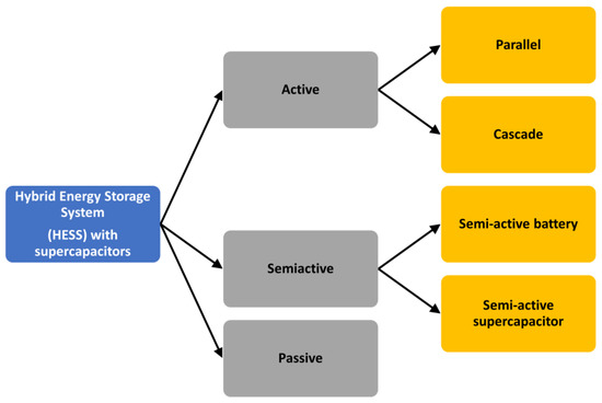 Classification of hybrid energy storage systems with battery and supercapacitors (HESS) (adapted from [22]).