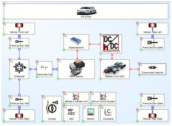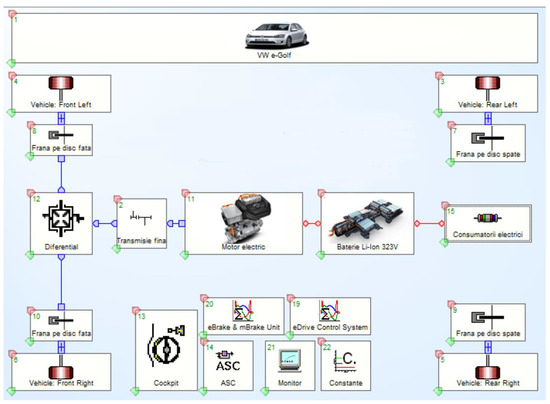 The virtual electric vehicle model of a VW e-Golf was created and developed with the AVL CRUISE software (Figure 7). The constructive data of the vehicle were taken from the technical documentation of the manufacturer.