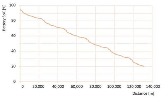 The validation of the model consists in the comparative analysis of the EV e-Golf’s autonomy following the simulations and the one provided by the manufacturer (Volkswagen GmbH) of 133.6 km for a 100% charge. For the simulation, the limit values of the battery charge level were chosen to be a maximum of 95% and a minimum of 20%, because a battery will never be charged to 100%, and after reaching the charge level of 20%, the energy performance decreases suddenly. In Figure 9, the charge level (state of charge—SoC) of the battery is represented according to the distance traveled, and under the considered conditions, the autonomy given by the manufacturer would be 113.56 km and the value obtained by the simulation was 114.50 km (error of 0.82%), which was considered to validate the numerical model used to analyze further the energy efficiency of an HESS for an EV using a simulation.