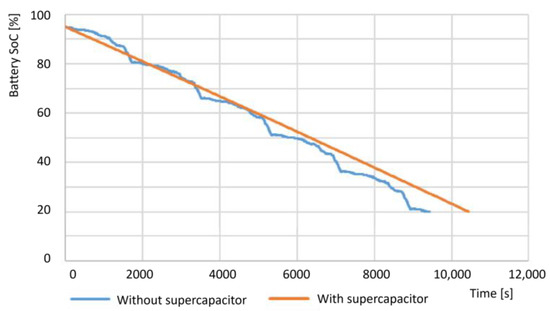 Currently, Li-ion batteries are widely used as energy storage systems in EVs due to their high energy density, operational safety, reliability, and increasingly low production cost. However, the peculiarities of their operation and exploitation make frequent charge–discharge cycles directly affect the life of the batteries [3]. By adding more supercapacitors, which will lower the battery’s maximum current, battery performance can be increased (Figure 4). Supercapacitors have a long lifespan and a high power density of over 6000 W/kg due to the absence of chemical variations at the electrodes; however, the relatively low energy density of 5 Wh/kg [45] prevents the use of supercapacitors as the primary energy sources in an EV.