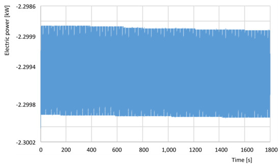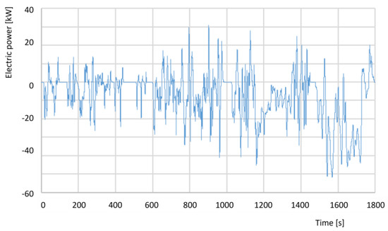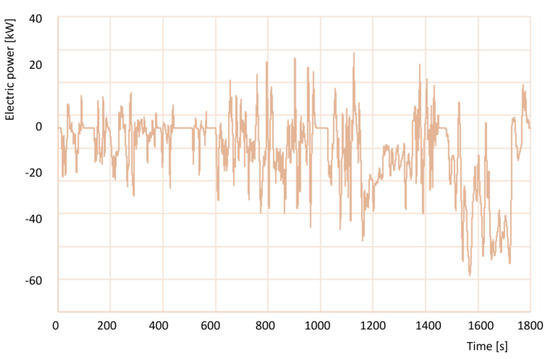 Figure 13 shows the variation in the electric power of the battery when working in tandem with the supercapacitor pack. To be able to better analyze the variation in the electric power of the battery as a function of time, this graph was made using only one WLTP cycle. The Li-ion battery constantly provides energy for the supercapacitor while it powers the electric motor or absorbs energy from braking and as can be seen from the graph, the electric power of the battery is stable and works at about 2.99 kW. In contrast, the electric power of the battery without a supercapacitor varied between −50 and 30 kW with frequent fluctuations, as seen in Figure 14.