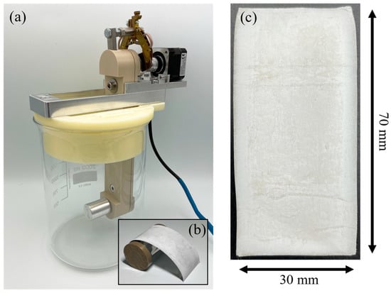 The deposition experiments were carried out using a three-electrode system and 1000 mL of the electrolyte in a 2000 mL beaker. Two aluminum sheets served as counter electrodes, a cylinder as working electrode and the aluminum wire as reference electrode. All electrodes were initially cleaned with isopropyl alcohol. Counter electrodes were fixed in parallel at a distance of 95 mm. The cylinder was placed equally distant between the counter electrodes. During deposition experiments the cylinder was rotating horizontally, as shown in Figure 1a.