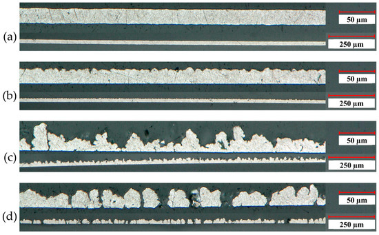 Analysis of the WLI images in Figure 3, together with the corresponding values for areal roughness provided in Table 2, delivers further information on the surface characteristics of the aluminum foils. Observing the coloring of the images, which provides a qualitative assessment of the surface roughness variations, one can easily see that the roughness increases from image (a) to image (d). Together with the measured profile lines in Figure 4, this observation is consistent with the results obtained from the cross-sectional analysis in Figure 2.