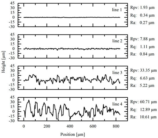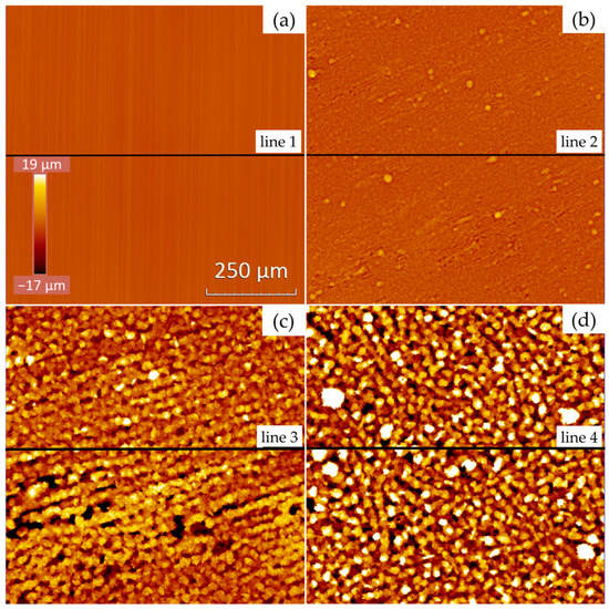 The aluminum foils’ surfaces shown in Figure 2 were further examined by WLI to obtain detailed information on the surface topography. The resulting images are displayed in Figure 3. The naming (a–d) of the single images was conducted in analogy to Figure 2. At mid-height on each image, a horizontal line was drawn, indicating the position of the measured profile lines as presented in Figure 4. The roughness values corresponding to these profile lines are also provided.
