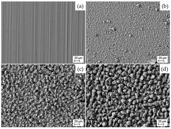 Figure 5 shows SEM images of the different aluminum foils. The naming of the images (a) to (d) was conducted in accordance with the corresponding Figure 2 and Figure 3. Image (a) shows a typical surface of a foil obtained by a rolling process. As can be seen, the grain size of the electrodeposited aluminum increases from image (b) to (d). In image (b) the grains have a predominantly fine structure, with occasional larger, coarser grains scattered across the surface. This variation in grain size is indicative of the applied electroplating process. In contrast, image (d) shows a distinct grain morphology characterized by the presence of very large grains. This suggests that the deposition parameters used to produce the aluminum foil in image (d) have resulted in more pronounced grain growth vs. seed formation. Image (c) presents an intermediate state between images (b) and (d). It comprises a combination of fine and coarse grains, indicating a mixed-grain structure on the surface.