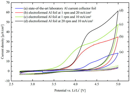 Figure 6 depicts cyclic voltammograms (CVs) of the 1st and 10th cycles represented by solid and dotted lines, respectively. CVs were recorded using different aluminum foils as working electrodes in a three-electrode set-up, in the voltage range between 2.7 and 5.0 V vs. Li/Li+ at a scan rate of 10 mV/s. In this configuration, lithium was used as counter and reference electrode. The aluminum foils examined in the present work include a state-of-the-art laboratory aluminum current collector foil (a) as well as electroformed ones deposited with 1 rpm and 20 mA/cm2 (b), 1 rpm and 10 mA/cm2 (c) and 20 rpm and 10 mA/cm2 (d). The anodic current densities during the 1st cycle show noticeable differences between the various foils. However, as the cycles progress up to the 10th cycle, these differences tend to diminish and the anodic current densities converge towards close values for all the foils. The similar convergence of anodic current densities during the 10th cycle indicates that the electroformed foils can likewise be suitable for lithium-ion battery applications as current collectors.