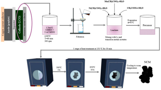 The undissolved residue was removed via filtering in order to obtain the leachate solution containing Co2+ ions. After this, Ni, Mn, and Li acetates were added to the leachate solution in a stoichiometric ratio in order to subsequently obtain the NCM material. The calculation was carried out in the following way: after the end of the leaching process, the filtrated residue was dried for 24 h and weighted. The obtained mass was subtracted from the initial cathode mass—this was the theoretical dissolved cathode mass in the solution. This value was multiplied by 0.92 to obtain the active mass in the solution. The most common ratio of cathode material: binder PVDF: conductive additive is 92:5:3, which is used while coating on a current collector. Afterwards, the active mass was multiplied by 0.59—this was theoretical cobalt mass in the solution. Then, this value was divided by the Co molar mass (59 g/mol) to obtain the amount of Co2+ ions. Furthermore, to calculate the NCM111 amount, the cobalt amount was multiplied by 3. Then, the masses of Ni(CH3COO)2∙4H2O (NiAc), Mn(CH3COO)2∙4H2O (MnAc), and CH3COOLi∙2H2O (LiAc) were calculated based on the substance amounts (the NiAc and MnAc amounts were equal to the Co amount, and the LiAc value was equal to the NCM111 amount) and respective molar masses. The next step was water evaporation from the resulting solution with the forced removal of gases. The obtained precipitate was used as the precursor for the following synthesis of the NCM cathode material through heat treatment. The scheme of the process is presented on Figure 1. The heat treatment stages are described in more detail in the Supplementary Materials.