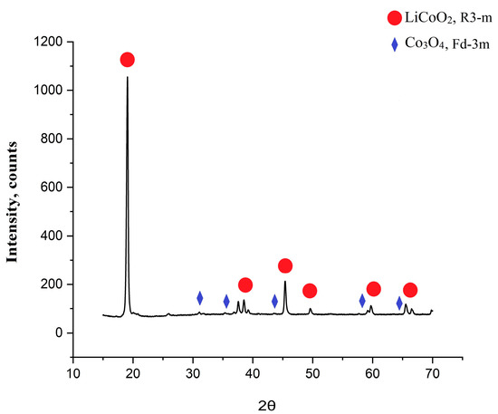 Figure 2 shows a diffractogram of the initial cathode material of the LCO type. Lithium cobalt oxide peaks belonging to the spatial group R3 m are clearly observed. In addition, Co3O4 peaks belonging to the Fd-3m group are observed, which can be explained by the fact that, during the charging process, the Li2O/Co mixture could be oxidized into Co, and then the Li2O/CoO mixture could result in the formation of Co3O4 in the higher-voltage region [38].