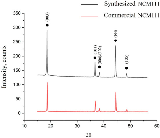 Figure 3 shows an X-ray diffractogram of the synthesized cathode material of the NCM111 obtained based on the extracted cobalt, and for comparison, a diffractogram of commercial NCM111 material is also added. The patterns of the synthesized NCM material were indexed to layered oxide with an R-3m space group without any peaks of the impurity phase. The peaks were consistent with the standard card of Li(Ni1/3Co1/3Mn1/3)O2 (PDF#01-075-9200). The distinct peak split corresponding to the (006)/(102) planes suggests a well-ordered, layered structure.