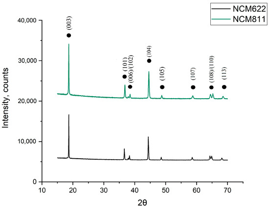 A comparative diffractogram of the synthesized materials is presented in Figure 6. Obviously, typical peaks of the phase of triple-lithiated transition metal oxide NCM are observed in the two synthesized materials. All the materials had a separation of peaks 006/102 and 108/110, which indicates a good ordering of the layered structure of the materials. Due to the heat treatment of the precursor for the synthesis of the NCM811 material in oxygen flow, it was possible to obtain a material with a good crystallinity.