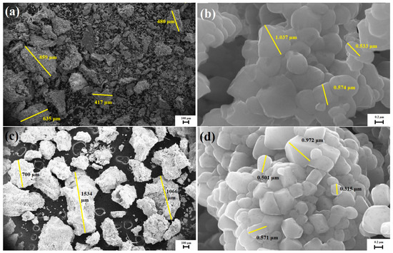 The SEM photographs of the obtained materials. (a,b)—NCM622, (c,d)—NCM811.
