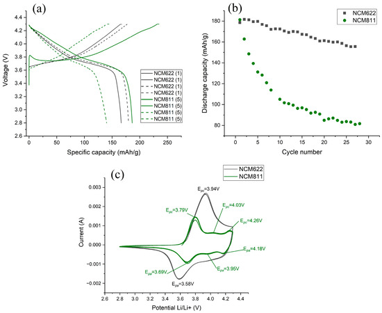 Peaks of reversible intercalation/deintercalation potentials were also observed for the material NCM811. The cathode peak was present at 3.79 V, and the anode peak at 3.69 V. In addition to these, there were also less obvious redox peaks at 4.03/3.95 V and 4.26/4.18 V, which appeared during the charge due to multiphase transitions from hexagonal to monoclinic (H1/M), from monoclinic to hexagonal (M/H2), and from hexagonal to hexagonal (H2/H3) [48]. The absence of an H2/H3 phase transition with a lower Ni content in the material NCM622 indicated a good reversibility of the electrode and significantly affected the stability of the material structure, which also explained the lower loss of capacitance during charge/discharge of the material NCM622.