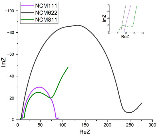It is worth noting that, for samples NCM 111 and 622, there was no semicircle in the high-frequency region of the spectrum associated with the CEI response. For NCM 811, three semicircles can be observed, instead of two classic ones. Taking into account the corresponding forms of impedance hodographs, the simulation was carried out according to the schemes shown in Figure 11. It can be assumed that a different shape of the hodograph for NCM 811 is associated with phase transitions, which were also noticeable on the CVA graphs. Since the equivalent circuits were used differently, it is proposed to compare the total resistance of the samples, minus R1, since it did not relate to the material under study (Table 7).